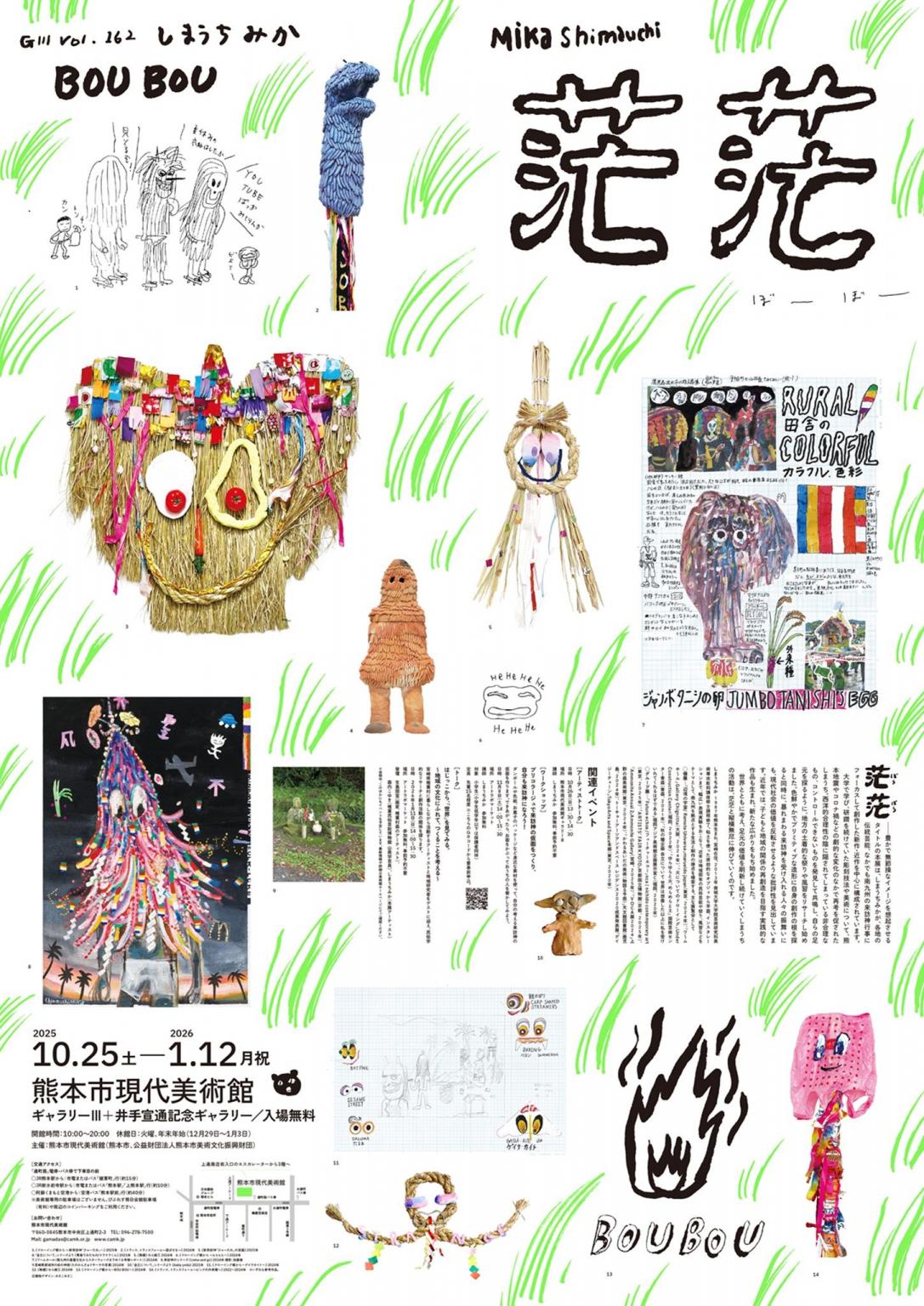 期間:2025年10月25日〜2026年1月12日茫茫(ぼうぼう)ーー豊かで無節操なイメージを想起させるタイトルの本展は、しまうちみかが、各地の伝統芸能、なかでも南九州の来訪神行事にフォーカスして創作した新作・近作を中心に構成されています。
