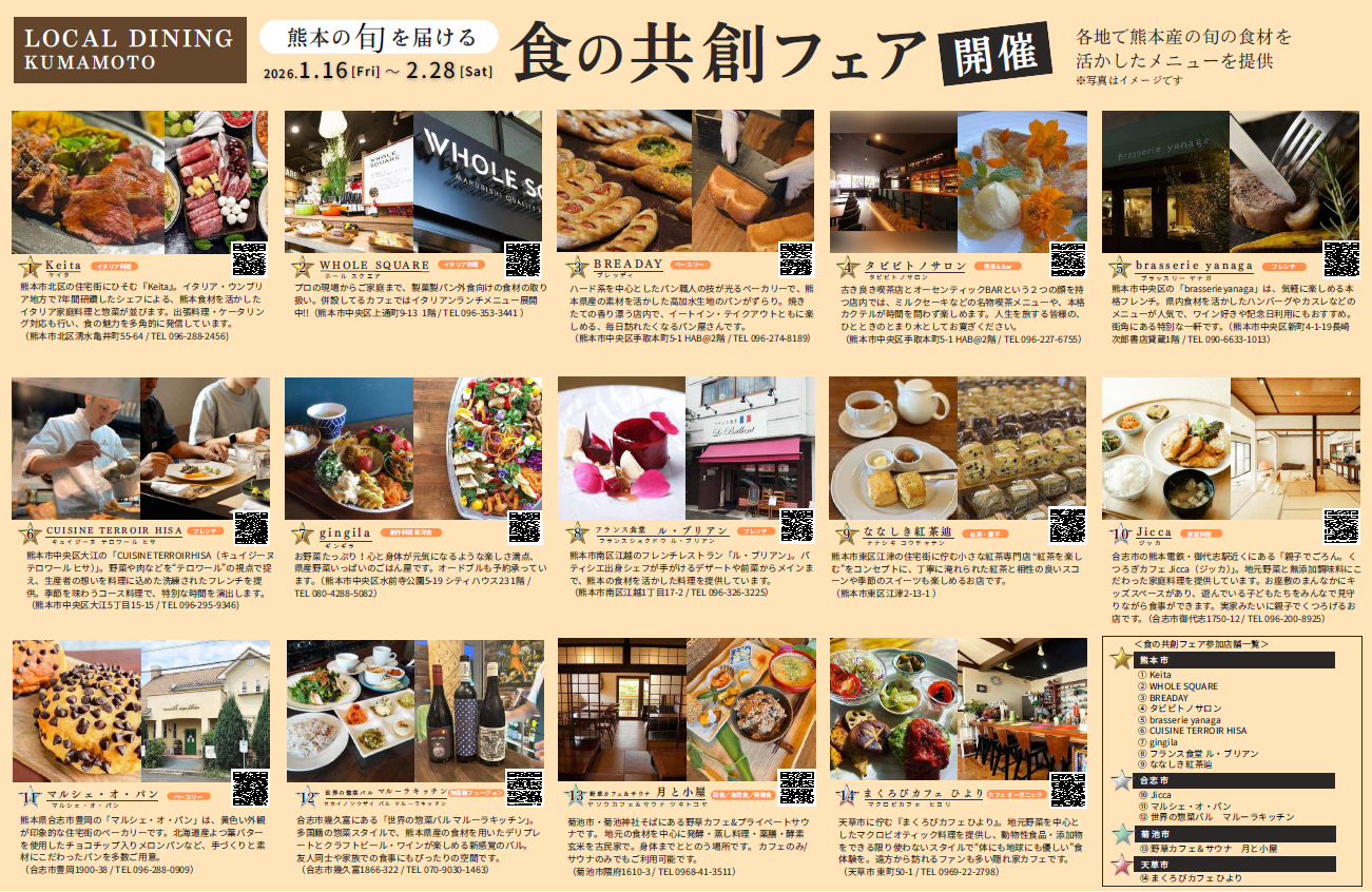 期間:2026年1月16日(金)~2月28日(土)熊本が誇る旬の食材を贅沢に使った特別メニューを、各地の飲食店でお楽しみいただけます。