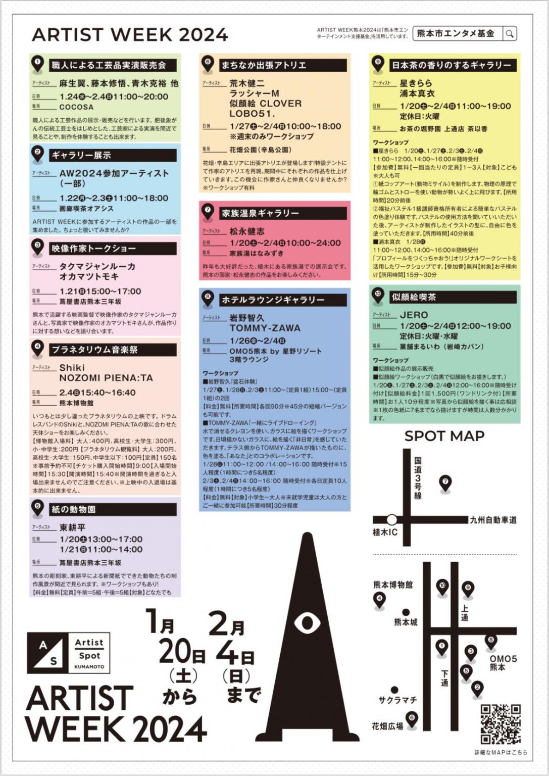 期間:2024/01/20〜2024/02/04大人もこどもも楽しめるアートイベント「ARTIST WEEK 熊本2024」を2024年1月20日(土)から2月4日(日)まで熊本市内アチコチで開催いたします。