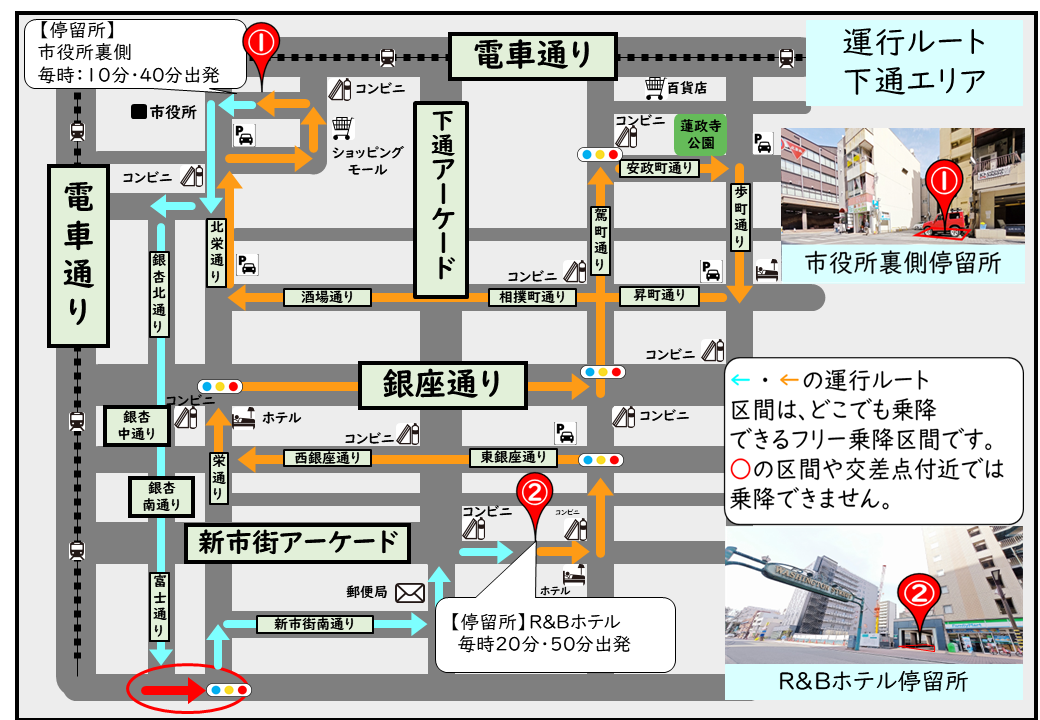 乗車方法 停留所(市役所裏側・R&Bホテル)でお待ちいただくか、運行中の車両に手を挙げて
