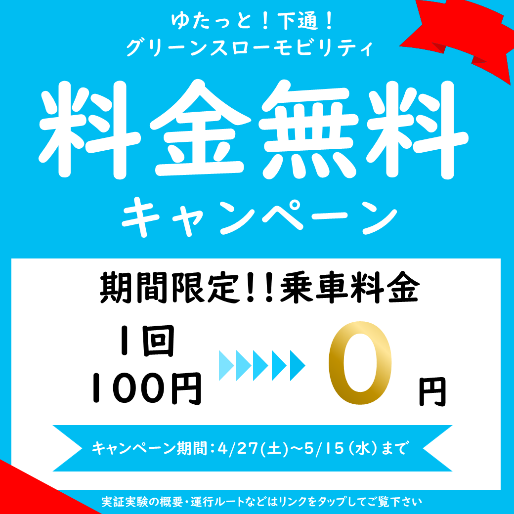 期間:2024年4月27日(土)~5月15日(水)下通エリアで実証実験中のグリーンスローモビリティの乗車料金無料キャンペーンを行います!ベビーカーやキャリーケースをお持ちの方もご乗車できますので、この機会にぜひご利用ください!!