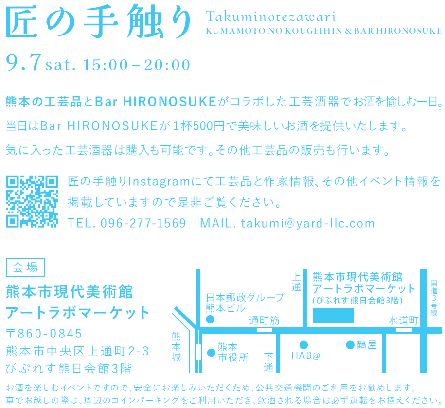 期間:2024年9月7日(土)15:00~20:00熊本の工芸品とバーヒロノスケがコラボした工芸酒器でお酒を楽しむ1日。