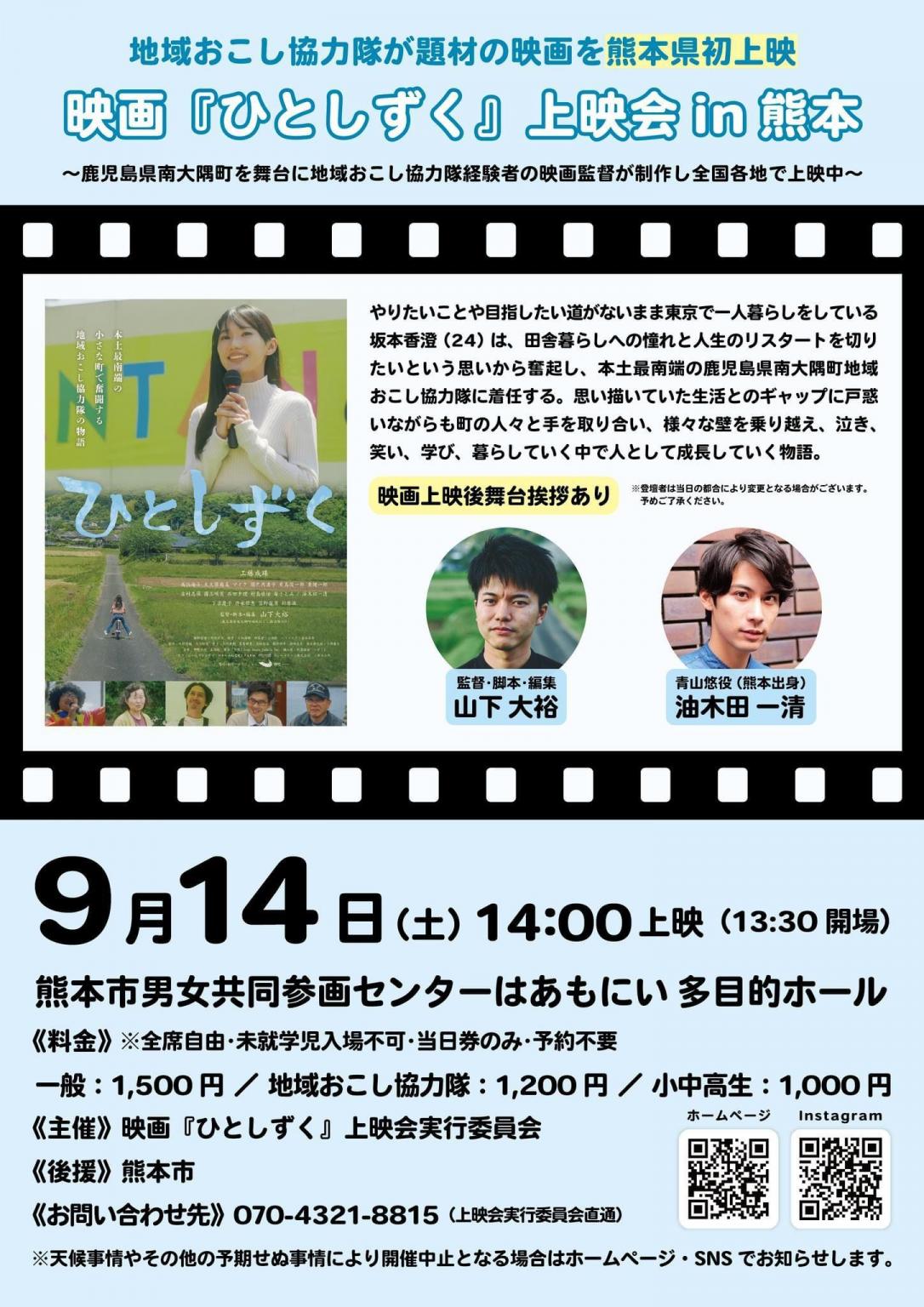 期間:9月14日(土)13:30開場/14:00上映開始映画『ひとしずく』の、熊本市での上映が決定いたしました!