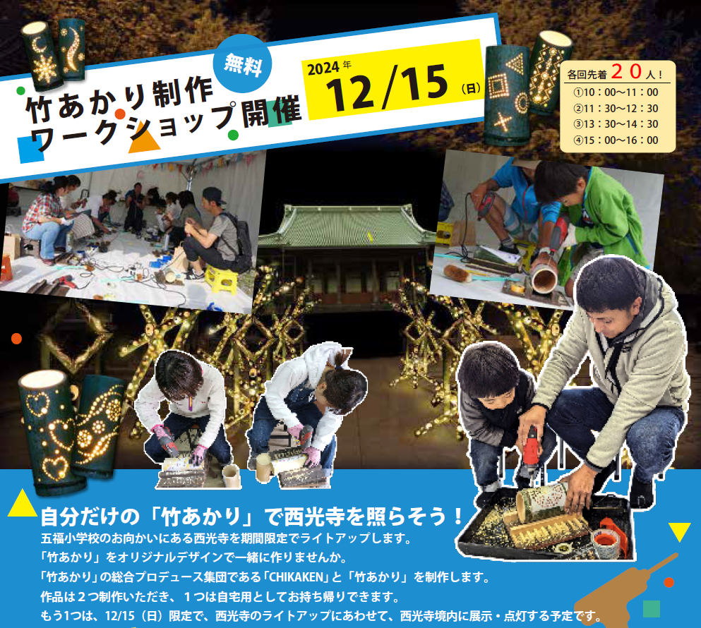 「竹あかり」の総合プロデュース集団「CHIKAKEN」と一緒に、西光寺に設置する竹あかりを制作しませんか??