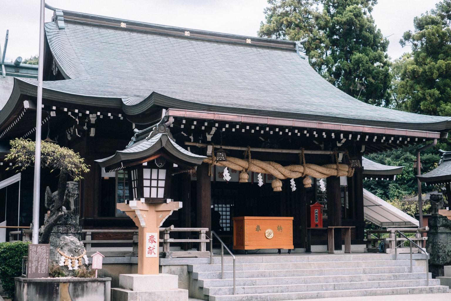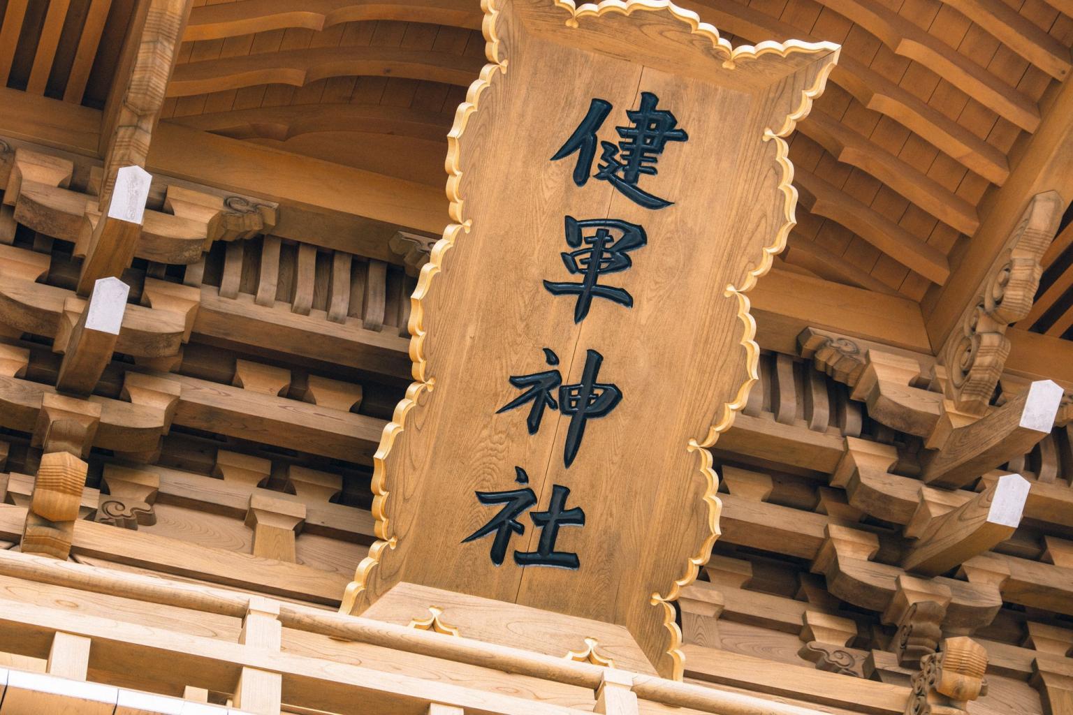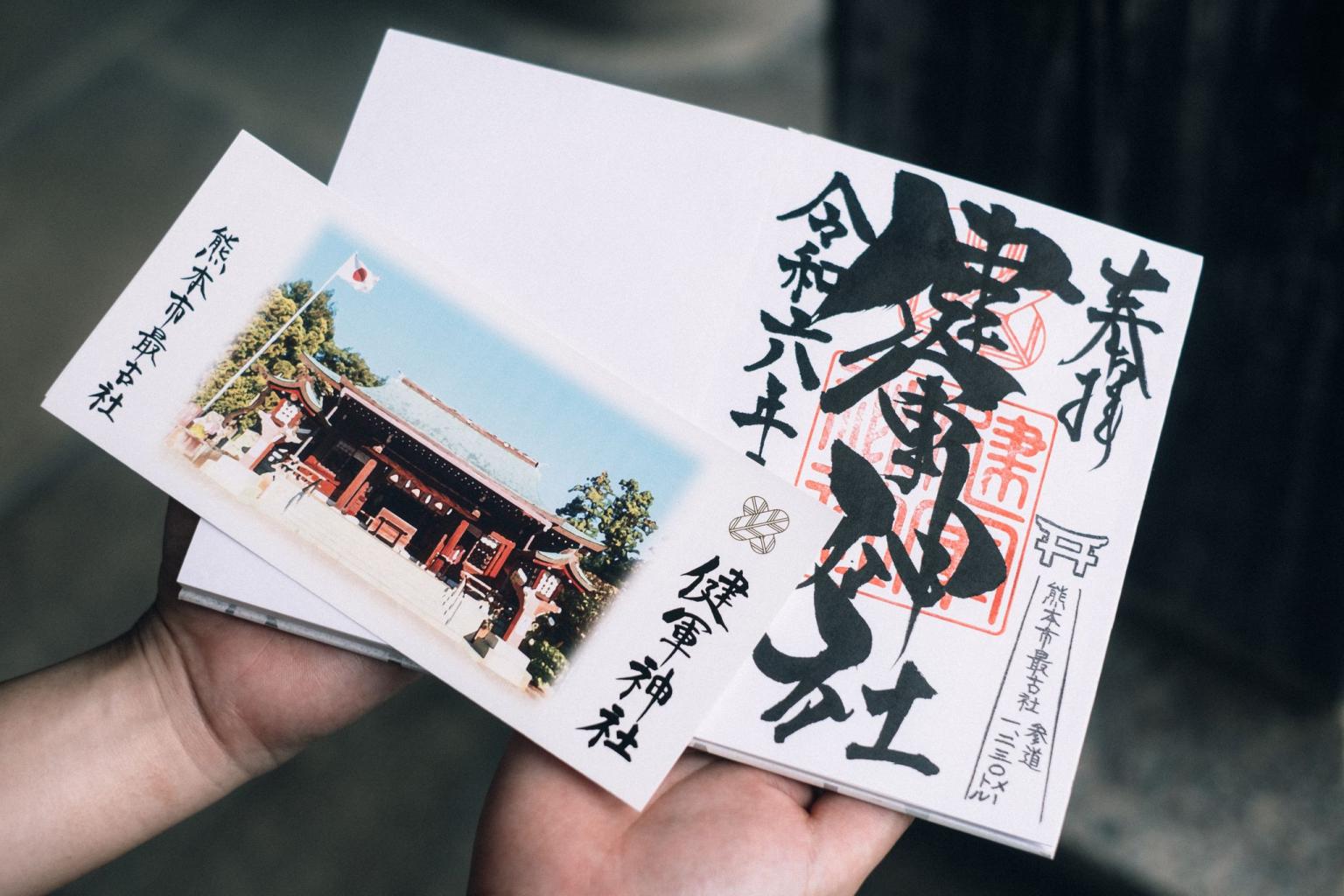 熊本市では最も古い神社で、昔は「たけみや」と言い、のちに「けんぐん」と読まれるようになりました。阿蘇四社のひとつで、電車通りの大鳥居から神社まで続く、八丁馬場(はっちょうばば)と呼ばれる約1200mの長い参道には、加藤清正(かとうきよまさ)の頃植えられたと伝えられる杉並木の一部が残っています。明治10年2月22日、西南戦争で、薩軍を救援するため結成された熊本隊の挙兵の場所です。